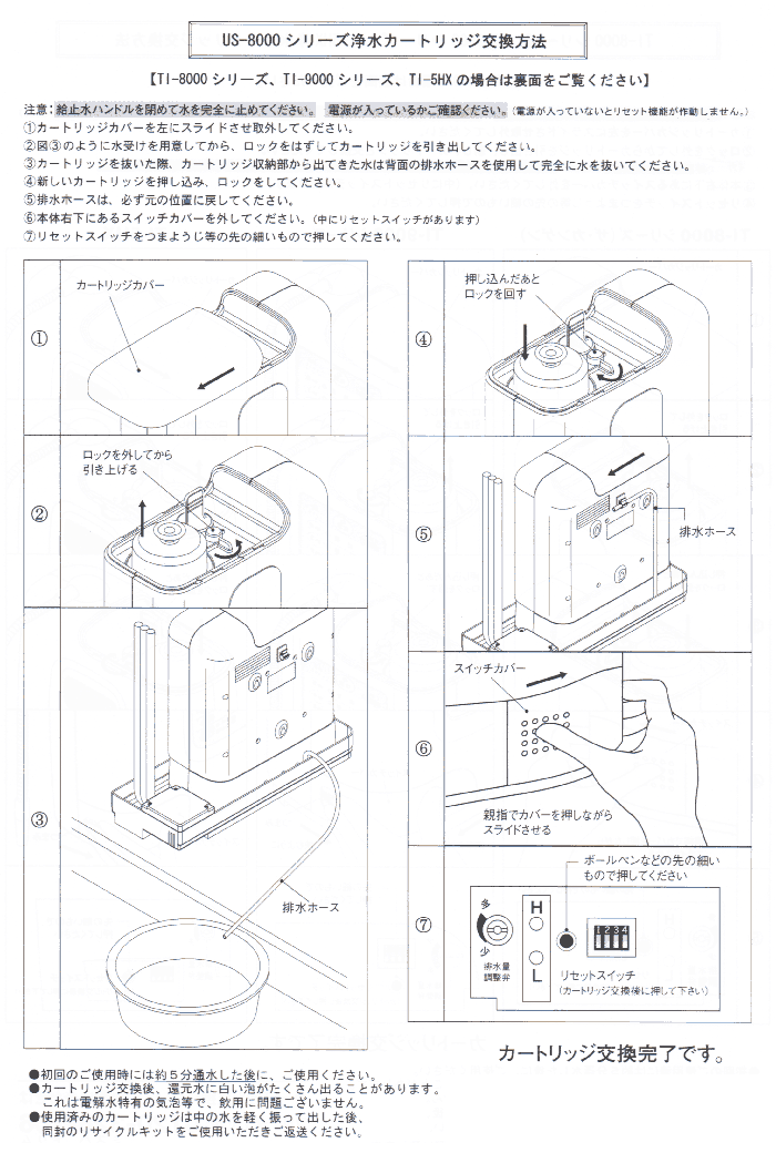 | 除去可能な物質 ※総ろ過水量全て24トン | 遊離残留塩素(カルキ)CAT(農薬) 2-MIB(カビ臭) 溶解性鉛 |